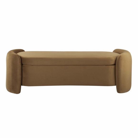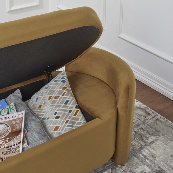 Relax amidst trending style and modern comfort with the Nebula Performance Velvet Upholstered Accent Bench. Bringing appreciated texture to your living space, entryway, bedroom, office, or other seating area, this accent bench is upholstered in a beautiful stain-resistant performance velvet fabric. Dense foam padding offers a premium seating experience and is perfect for kicking up your feet and relaxing. This storage bench has a hinged seat that opens to an 80° angle to reveal the spacious storage area perfect for hiding TV remotes, an extra blanket, magazines, books, and more.