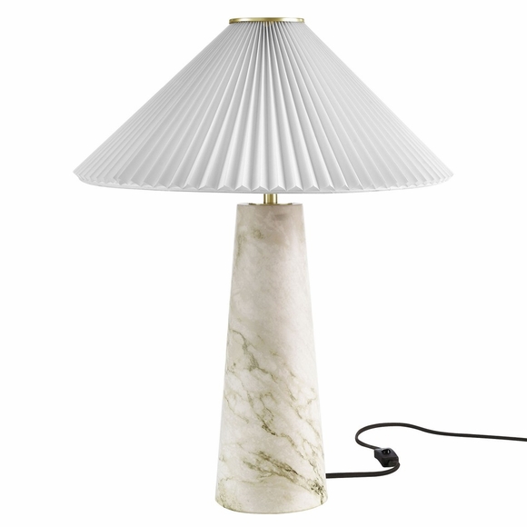 Brighten your space with the warm glow and vintage charm of the Nera Marble Table Lamp. Featuring a sleek metal body with a marble pattern and a pleated fabric lamp shade, this tapered table lamp mixes great style with everyday practicality. The retro-inspired pleated shade is topped with a brass metal plate, enhancing its look. Ideal as a single living room table lamp, a bedside nightstand lamp, a home office desk light, or for a cozy reading corner, the Nera Faux Marble Lamp emits a soft, ambient glow that creates a warm, inviting atmosphere. The woven black fabric cord allows this side table lamp to integrate seamlessly into any setting, while the in-line on/off switch adds convenience. ETL listed for safety, this entry table lamp requires one E26 40W bulb (not included). Assembly required.