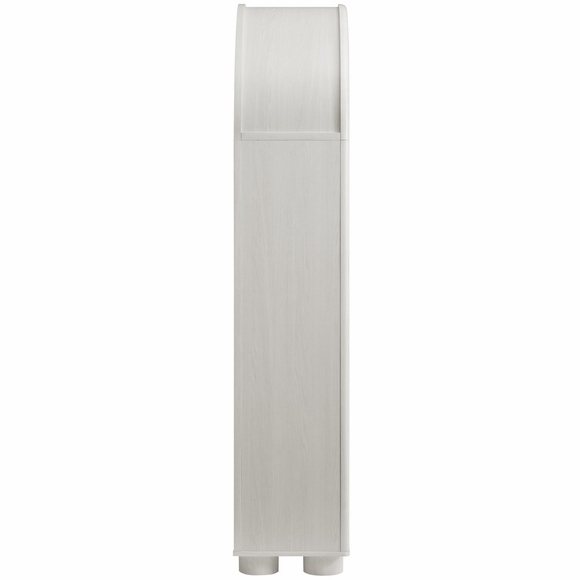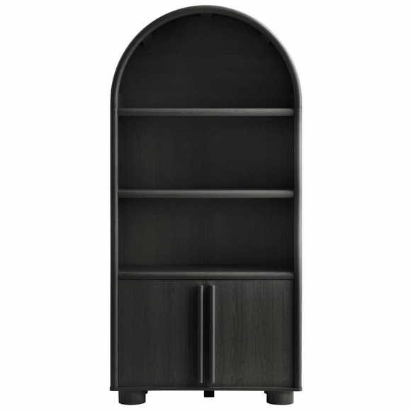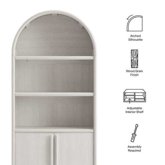 The Nolan Display Cabinet combines functional storage versatility with charming modern farmhouse style. Crafted with a beautiful wood grain laminate, the chic design flaunts subtle edge trimming and an elegantly rounded, arched top shelf. Supported by tapered wood legs, the Nolan tall storage cabinet combines open shelving with concealed storage. The upper section includes two adjustable shelves flanked between two fixed shelves, perfect for displaying decor and books. The lower section is enclosed by two solid doors, which open to reveal two adjustable shelves inside, creating four compartments for additional storage. Complete with soft-close hinges and metal ring pull handles with a brushed gold finish, this wood storage cabinet is as stylish as it is practical. Perfect for your living room, hallway, or dining area, this arched bookcase effortlessly adds an air of sophistication and vintage allure to your home. To protect your flooring, the Nolan Wide Storage Cabinet comes equipped with non-marking foot pads. Assembly required. Weight Capacity of each shelf: 44 lbs