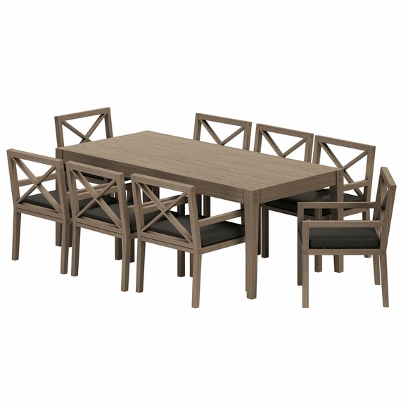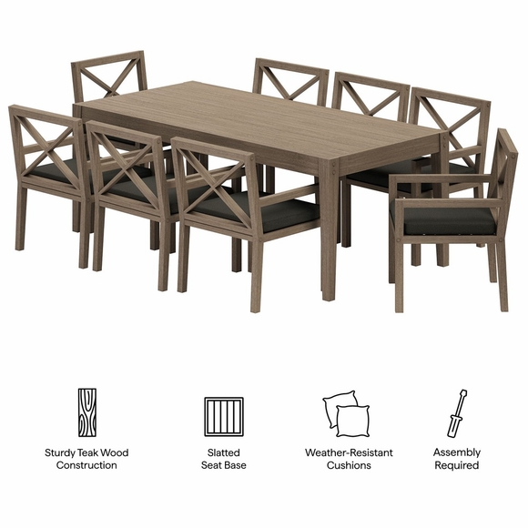Soak in nature's beauty with the Northlake 9-Piece Outdoor Patio Dining Set, featuring a spacious dining table and eight matching armchairs. All crafted from durable teak wood, the 83-inch rectangular table showcases clean lines and a smooth plank-style top, creating a modern yet timeless setting for outdoor dining. The coordinating armchairs are designed with distinctive cross-back frames for added support and a refined aesthetic. Each patio chair includes a plush, all-weather cushion that is water-resistant, fade-resistant, and quick-drying for lasting comfort, while slatted seat bases encourage airflow and durability. Perfect for patios, decks, and garden gatherings, this teak patio dining set blends elegant craftsmanship with lasting outdoor performance. Includes non-marking floor glides for added protection. Assembly required.