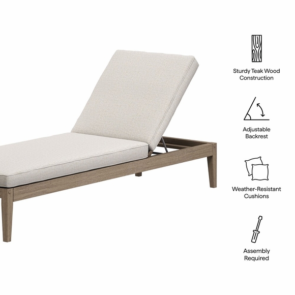 Soak in nature's beauty as you recline with the Northlake Outdoor Chaise Lounge. Crafted from durable teak wood, this sleek poolside lounger features a slatted seat for breathability and a backrest accented by a distinctive cross-back frame for added support. Designed for ultimate relaxation, the adjustable backrest offers three reclining positions, allowing you to sit upright, lounge back, or lay flat. The plush, weather-resistant cushion provides water-resistant, fade-resistant, and quick-drying comfort for year-round outdoor use. Whether by the pool, on the patio, or anywhere under the sun, the Northlake Chaise Lounge blends timeless craftsmanship with modern convenience. Assembly required. Weight Capacity: 278 lbs.
