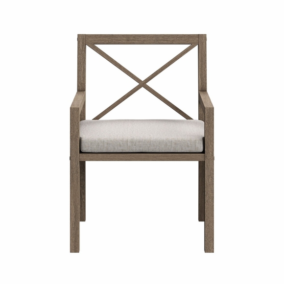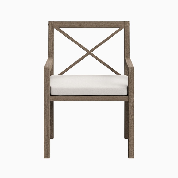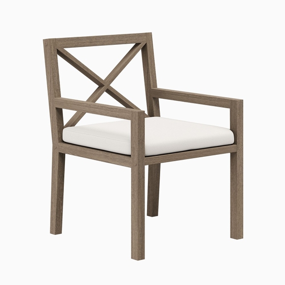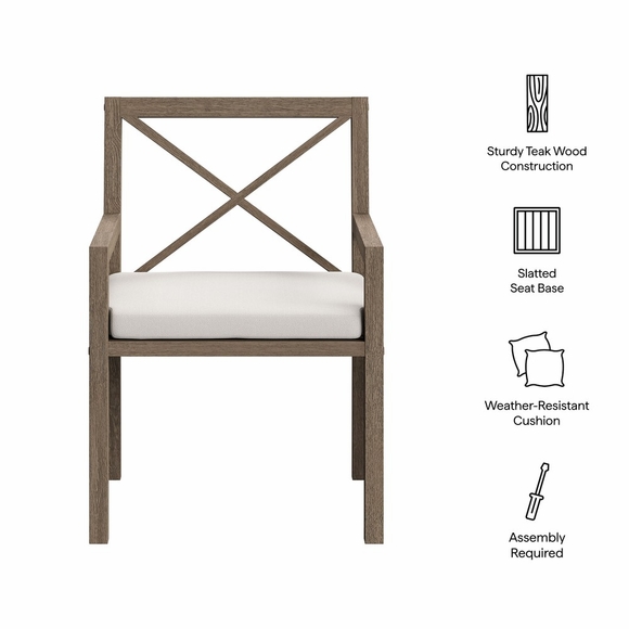 Soak in nature's beauty while dining al fresco with the Northlake Outdoor Teak Dining Chair, a stylish and durable addition to any patio or deck. Expertly crafted from sturdy teak wood, this outdoor dining armchair features a distinctive cross-back design that enhances both support and aesthetic appeal. The slatted seat base promotes airflow and durability, while the plush, all-weather cushion offers water-resistant, fade-resistant, and quick-drying performance for lasting comfort. Whether gathered around a dining table or used as a standalone accent chair, the Northlake Outdoor Patio Dining Chair blends timeless craftsmanship with modern outdoor luxury. Includes non-marking floor glides for added protection. Assembly required. Weight Capacity: 500 lbs.
