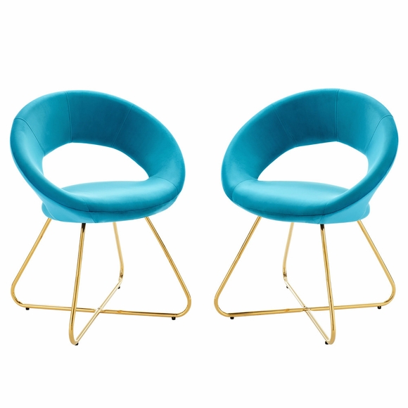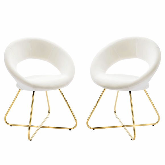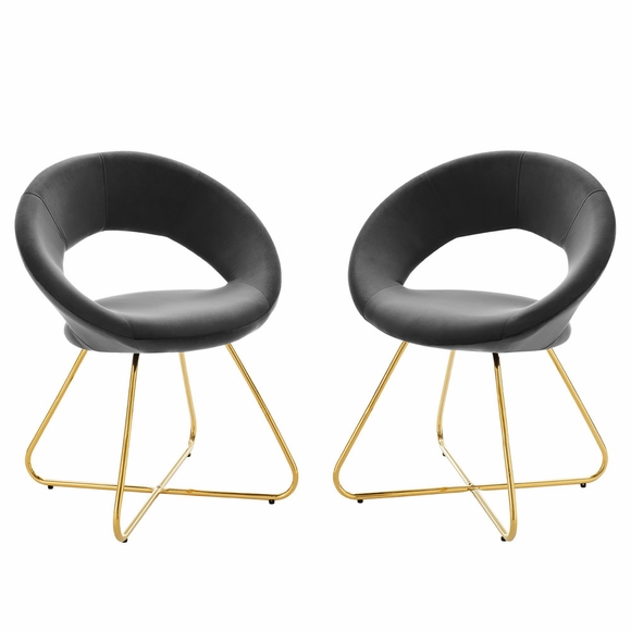The Nouvelle Performance Velvet Dining Chair Set of Two is a buoyant and intriguing fusion of shapes that energizes your dining space, living room, or bedroom. This beautifully balanced side chair set fits well in modern, contemporary, or minimalist settings. The rounded backrest, upholstered in stain-resistant performance velvet fabric, flows seamlessly into the circular seat cushion for a profoundly satisfying effect. Bolstered by dense foam padding, the contoured seat rests on polished gold hairpin legs, rendering this a whimsical accent chair for your dining room or entryway. Legs are fitted with non-marking foot pins.