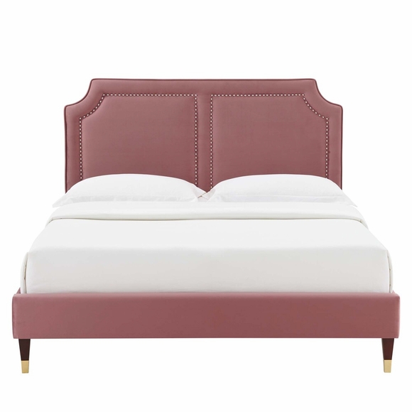 Cultivate an inspiring and upscale aesthetic in your master bedroom or guest room with the refined Novi Performance Velvet King Bed. The upholstered headboard is built with a solid plywood frame with artfully notched corners. The soft silhouette of the modern headboard is enhanced by the precise nailhead trim for glam deco style in mid-century modern or eclectic decors. This king-sized platform bed is tailored in stain-resistant performance velvet and features a well-crafted MDF frame granting an enduring foundation for memory foam, innerspring, latex, and hybrid mattresses. A durable poplar wood slat support system ensures strength and steady support, eliminating the need for a box spring. The slatted bed frame has a reinforced center beam with two support legs for enhanced stability. Novi stands on wood legs with gold metal sleeves and non-marking foot caps. Assembly required. Weight Capacity: 800 lbs.