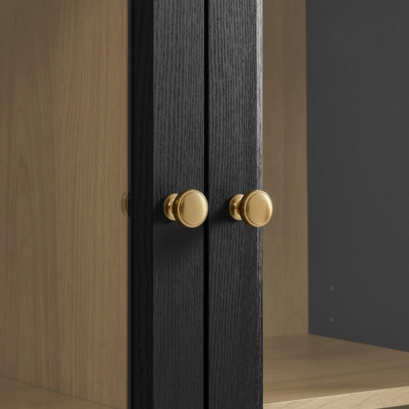 The Nyx Arched Display Cabinet offers a stunning combination of bold elegance and practical design. Its unique arched silhouette and wide, sturdy legs create a striking focal point, while the tempered glass doors with brass ring handles and soft-close hinges add a sophisticated touch. Inside, the cabinet features two adjustable shelves and one fixed shelf, providing ample space for displaying books, dinnerware, collectibles, and more. Two full-glide drawers offer concealed storage for organizing essentials, blending style with functionality. Perfect for use as a dining room hutch, living room storage cabinet, or display case in a home office, the Nyx Cabinet combines modern versatility with timeless charm. Equipped with non-marking floor glides, this arched storage cabinet protects your floors while making a statement in any space. Assembly required. Weight Capacities - Adjustable Shelves: 77lbs, Fixed Shelf: 121 lbs, Drawers: 22 lbs.