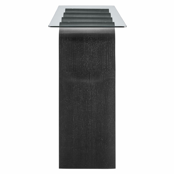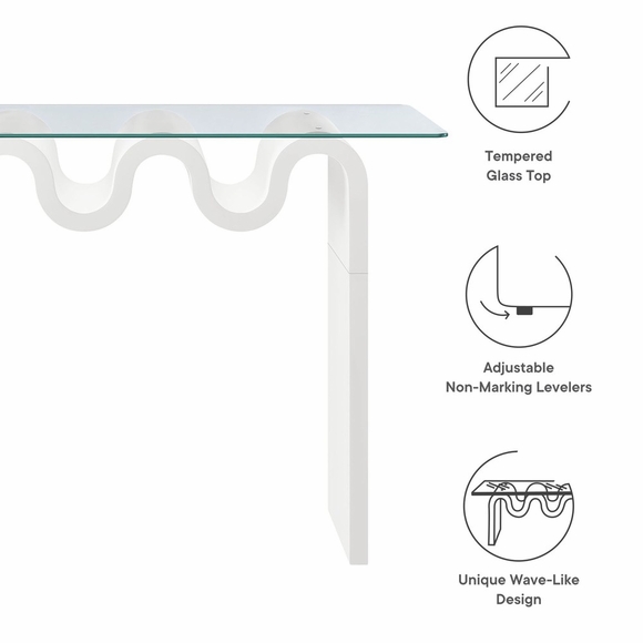 The Ondine Glass Console Table stands out with its unique retro design, adding an artistic touch to any space. Its trendy frame, shaped in a bold wave-like form across the top, is crafted from durable materials and finished with a natural ash veneer, providing a rich, textured look, or a solid color finish to add some flair to your space. The squiggle-shaped foundation of this curved console table brings a sense of movement and fluidity, beautifully contrasted by the clear tempered glass top above it. The glass surface allows the wavy base to remain fully visible, making it the focal point of the design. The rounded edges on this glass top console table add softness to the overall aesthetic, while the clear plastic anti-skid grips offer stability to ensure the glass is secure. The Ondine 50 inch narrow console table is equipped with leveling, non-marking feet that keep the clear console table securely in place without damaging your floors. Whether used as a glass entryway table, sofa console table, or even as a sleek accent piece in a home office, this funky console table serves as a conversation piece and complements both contemporary and vintage-inspired decor. Glass Accent Console Weight Capacity: 154 lbs.