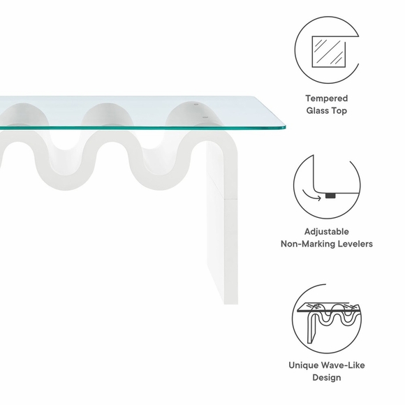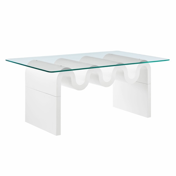 The Ondine Glass and Wood Coffee Table stands out with its unique retro design, adding an artistic touch to any room. Its trendy frame, shaped in a bold wave-like form across the top, is crafted from durable materials and finished with a natural ash veneer, providing a rich, textured look, or a solid color finish to add some flair to your space. The squiggle-shaped foundation of this curved coffee table brings a sense of movement and fluidity, beautifully contrasted by the clear tempered glass top above it. The glass surface allows the wavy base to remain fully visible, making it the focal point of the design. The rounded edges on this glass top coffee table add softness to the overall aesthetic, while the clear plastic anti-skid grips offer stability to ensure the glass is secure. The Ondine glass wood coffee table is equipped with leveling, non-marking feet that keep the table securely in place without damaging your floors. Whether placed in a living room, lounge, or office, this funky coffee table serves as a conversation piece and complements both contemporary and vintage-inspired interiors. Glass Coffee Table Weight Capacity: 154 lbs.