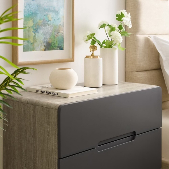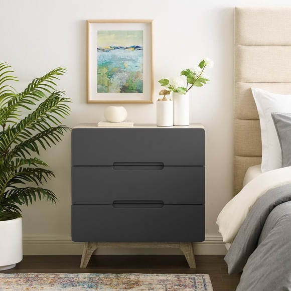 Bring the iconic energy of mid-century style to your bedroom or living room with the Origin Three-Drawer Chest or Stand. Crafted with durable fiberboard for reliable support, Origin comes with a splayed frame, rounded edges, linear design, wood grain veneer, and three full-extension drawers for concealed storage. The perfect complement to your bedroom or living room decor, display and store pictures, home accessories, clothes, and more with this contemporary modern chest or stand.