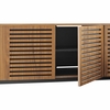 Redefine your living space with the Parker TV Stand. Featuring a beautiful design and organic aesthetics, this wooden TV stand brings stylish functionality to the living room, bedroom, and home office and its versatility allows it to double as a credenza, sideboard, buffet, or display stand in the dining room or entryway. Parker is crafted with MDF with walnut wood veneer and rests on powder-coated iron tube legs. Featuring a breezy design for flow-through ventilation, this TV stand is complete with adjustable-height shelves, anti-toppling straps, a cable management hole, and sliding doors that make up the back panel that can also be removed completely. The front doors of this media console feature soft-close hinges. Keep visual space clean with the ample storage space for media essentials with this TV stand that accommodates flat screen TVs up to 75".