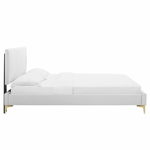 Reimagine master bedroom or guest bedroom decor with the Peyton Channel Tufted Performance Velvet Queen Bed. Rich in vintage modern elegance and glam deco style, the queen headboard of this platform bed features retro channel tufting, luxe velvet texture, and dense foam padding to offer a supportive place to rest while sitting up in bed. A queen size bed covered in stain-resistant performance velvet, this platform bed is a sturdy mattress foundation for memory foam, innerspring, latex, and hybrid mattresses. Eliminating the need for a box spring, the MDF frame of this queen bed is complete with a wood slat support system crafted with poplar for lasting durability and support. This slatted bed frame rests on black wood legs with non-marking foot caps and includes a reinforced center beam with two support legs for enhanced stability. Assembly required. Weight Capacity: 800 lbs.