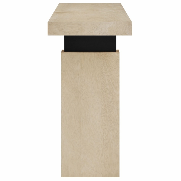 Combining streamlined design and natural beauty, the Piston 52" Wood Console Table is the ideal accent piece for modern farmhouse, contemporary minimalist, and organic interiors. Crafted with solid wood construction and finished in a stunning natural wood veneer, this rectangular console table exudes warmth and character. The sturdy, slab-style legs are connected to the tabletop with matte black metal supports, offering a clean yet bold aesthetic that enhances visual appeal while ensuring long-lasting durability. Perfectly sized for use as a wood rectangular sofa table, narrow entryway table, or accent table behind a couch, the Piston Console Table provides a functional surface for decor, lighting, or daily essentials. Non-marking adjustable levelers protect floors and ensure stability on uneven surfaces. Whether styled in a hallway, living room, or entryway, this narrow wood console table effortlessly blends versatility with timeless design. Assembly required. Weight Capacity: 200 lbs.