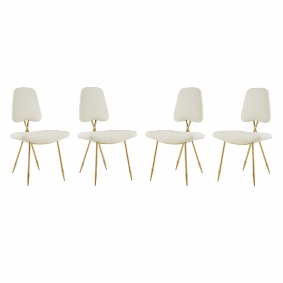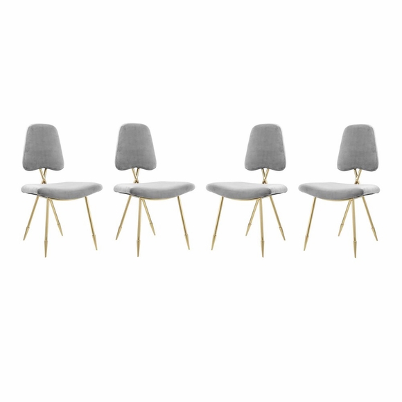 Survey your surroundings with confidence with the Ponder Dining Side Chair. Ponder's padded high-density foam seat gently slopes upward providing embracing comfort while the tapered back provides ergonomic support. Finely upholstered in luxuriously soft velvet, and supported by a sturdy gold stainless steel frame with four angled mid-century toothpick legs, Ponder makes a striking statement. Accentuate your modern decor with a contemporary side chair that elevates any empty area of your home.