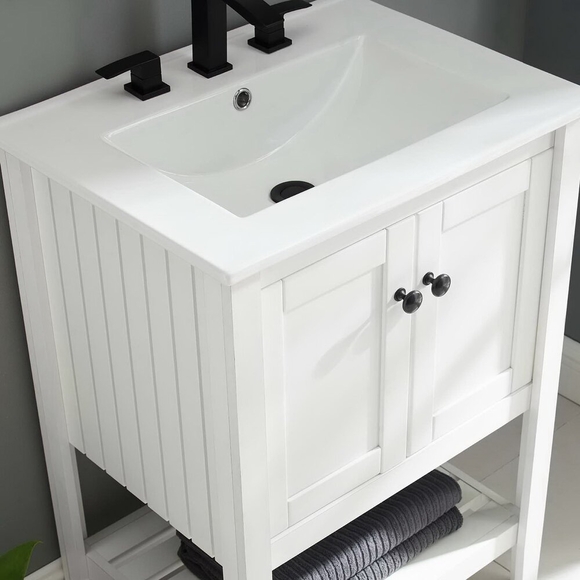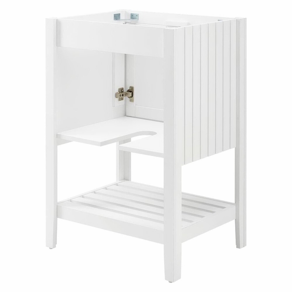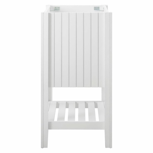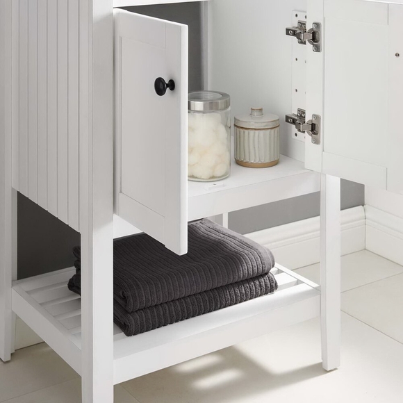 Mix rustic accents with crisp lines to produce the Prestige Bathroom Vanity. Prestige features a stylish side panel with a vertical slat design. Solidly constructed from wood and MDF particleboard, the Prestige Vanity has soft-close doors, interior hidden storage, and a slatted open exterior shelf. The Prestige Bathroom Vanity brings country cottage style to a new level with hints of industrial modern edginess. Comes with non marking foot caps to protect flooring. Assembly required, sink basin not included.