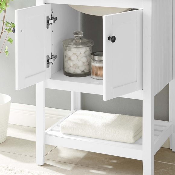 Mix rustic accents with crisp lines to produce the Prestige Bathroom Vanity. Prestige features a stylish side panel with a vertical slat design. Solidly constructed from wood and MDF particleboard, the Prestige Vanity has soft-close doors, interior hidden storage, and a slatted open exterior shelf. The Prestige Bathroom Vanity features a curved sink basin with 8-inch centerset faucet holes and brings country cottage style to a new level with hints of industrial modern edginess. Comes with non marking foot caps to protect flooring. Assembly required, fixtures not included.