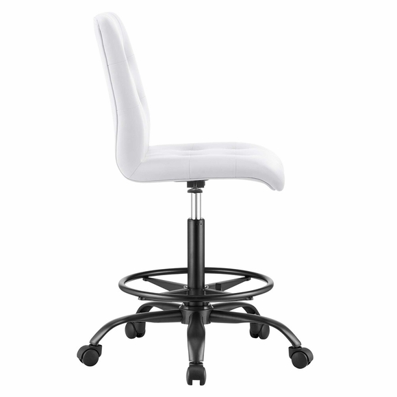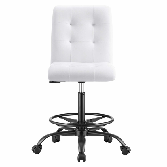 Etiquette presides over the properly styled Prim Armless Drafting Chair. Modern and luxurious, this swivel drafting stool features deep biscuit tufting, durable vegan leather upholstery, and elegant piped trim for added finesse. This vegan leather drafting chair is height adjustable, features a 360° swivel, and comes outfitted with a matte black base with five dual-wheel nylon casters. Perfect for standing desks, drafting tables, reception desks, and more, this drafting-height office chair is complete with dense foam padding for lasting comfort throughout the workday. Assembly required. Weight Capacity: 287 lbs.