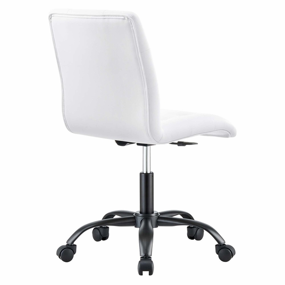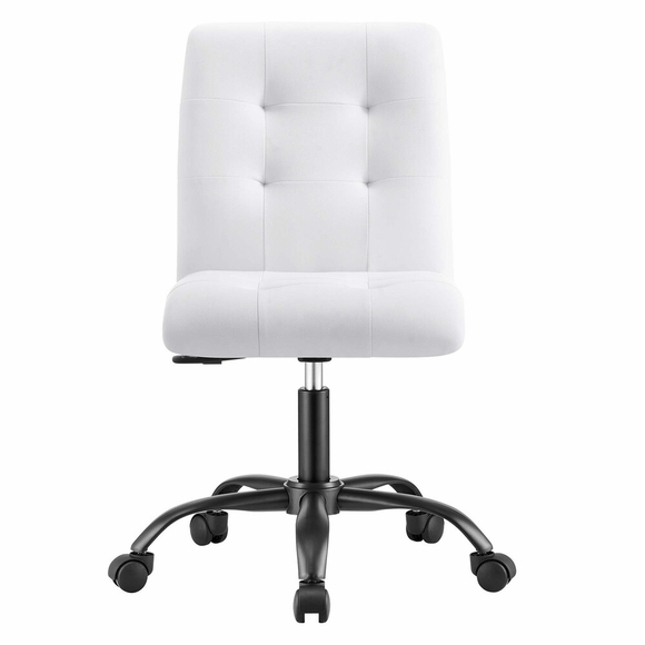 Etiquette presides over the properly styled Prim Armless Office Chair. Modern and luxurious, this swivel office chair features deep biscuit tufting, durable vegan leather upholstery, and elegant piped trim for added finesse. This vegan leather office chair is height adjustable, features a 360° swivel, and comes outfitted with a matte black metal base with five dual-wheel nylon casters. Perfect for conference rooms, workstations, desks, or college dorm rooms, Prim is complete with dense foam padding for lasting comfort throughout the workday. Assembly required. Weight Capacity: 287 lbs.