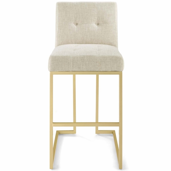 Maximize your dining room decor with Privy. A glam deco bar stool, Privy features soft and durable fabric upholstery for a streamlined modern look. This stylish bar stool rests atop a sleek gold stainless steel geometric base with a footrest that will elevate your bar and dining experience. No assembly required. Bar Stool Weight Capacity: 331 lbs.