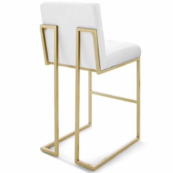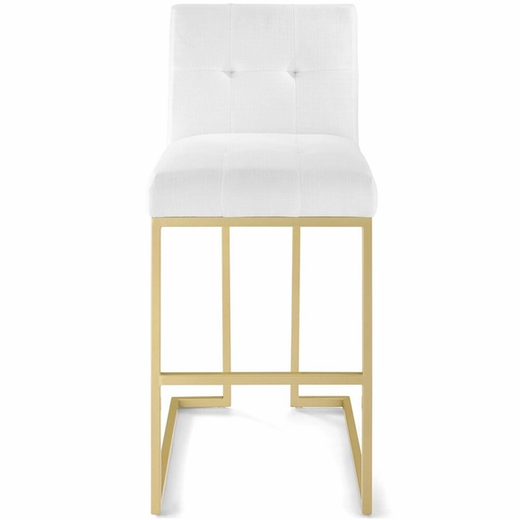 Maximize your dining room decor with Privy. A glam deco bar stool, Privy features soft and durable fabric upholstery for a streamlined modern look. This stylish bar stool rests atop a sleek gold stainless steel geometric base with a footrest that will elevate your bar and dining experience. No assembly required. Bar Stool Weight Capacity: 331 lbs.