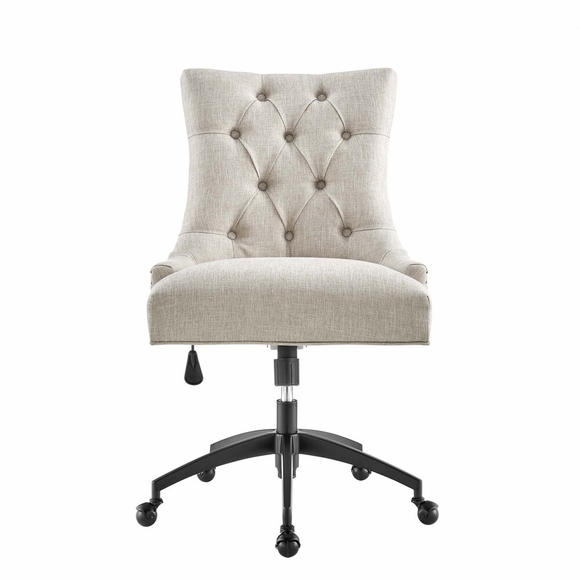 Introduce vintage flair and glam deco appeal with the Regent Tufted Fabric Swivel Office Chair. Metal nailhead trim and tufted buttons provide visual depth, while a luxuriously padded upholstered fabric back and seat for exceptional support to this superbly constructed computer desk chair. A matte black metal base and five single ball nylon casters provide easy movement over hardwood or carpeted surfaces while a full 360-degree swivel, tilt tension control, and pneumatic height adjustment create a custom seating experience for optimal performance. Perfect for the modern home or office, this fabric office chair is a desirable addition to any workspace. Chair Weight Capacity: 287 lbs.