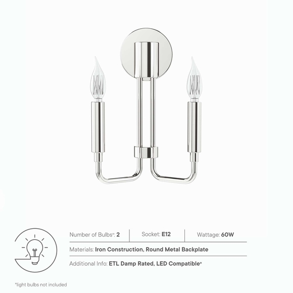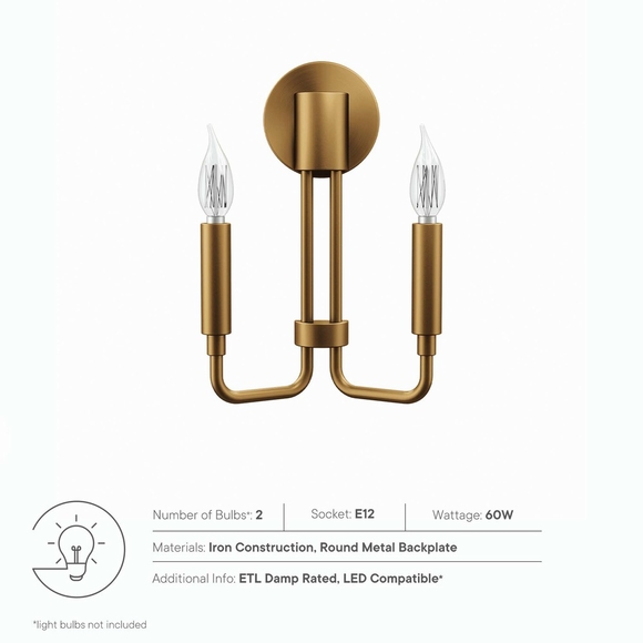 Illuminate your living space with the artful elegance of the Rekindle 2-Light Wall Sconce that complements a variety of decors from mid-century modern to minimalist contemporary. A timeless piece for a living room, dining room, entryway, hallway, home office, or bathroom, this sconce light features two upturned arms extending out from a cylindrical centerpiece and round backplate with ceramic lamp holders to host exposed light bulbs. The Rekindle Light Fixture is damp rated and requires two E12 light bulbs 60W max or LED equivalent (not included). Professional installation required.
