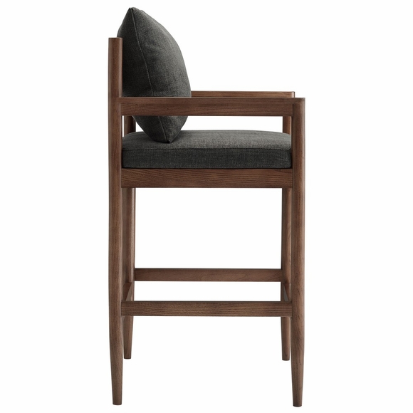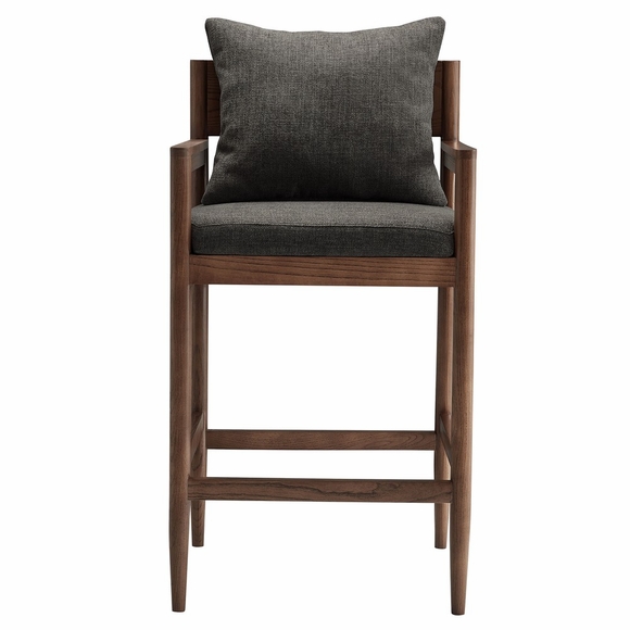 Blending modern elegance with modern comfort, the Remington Bar Stool offers a refined seating experience at your bar or high-top table. This 29-inch bar height stool features a solid elm wood frame with a rich finish, showcasing clean lines, an open back, and integrated armrests. A foam-padded seat and removable back pillow are wrapped in textured slub weave fabric for a soft, supportive feel. Tapered legs bring a Scandinavian touch, with a built-in footrest ensure durability and stability. Non-marking foot glides protect floors are included. Whether styled at a home bar, kitchen counter, or high-top dining area, this modern bar height chair enhances any contemporary setting. Weight Capacity: 300 lbs.