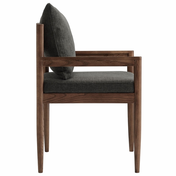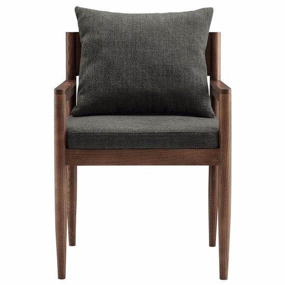 Blending modern elegance with timeless craftsmanship, the Remington Wood Armchair offers a refined seating experience. This upholstered accent armchair features a solid elm wood frame with a rich finish, showcasing clean lines and an open-back design. The foam-padded seat and removable back pillow are wrapped in a slub weave fabric, adding texture and comfort to living rooms, dining spaces, or home offices. Tapered legs bring a Scandinavian touch, while non-marking foot glides protect floors. Whether used as a living room accent chair, dining armchair, or desk chair, Remington's sophisticated design complements any contemporary setting. Arrives fully assembled. Weight Capacity: 300 lbs.