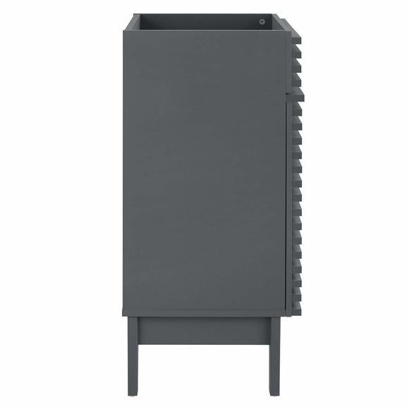 Tap into mid-century aesthetics with the Render 18" Vanity Cabinet. The Render Bathroom Vanity features a durable particleboard frame with a smooth laminate, four tapered wood legs, and an adjustable storage shelf behind a soft-close hinged door. Sleek lines and crisp design align for an edgy style designed to meet your needs. Boasting a mid-century modern style, this vanity features a solid construction with a pleasing look and practical functionality. Assembly required. Sink basin and fixtures not included.