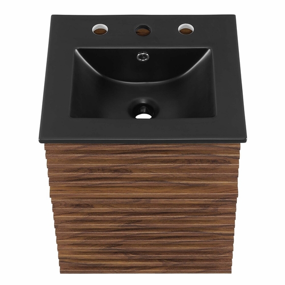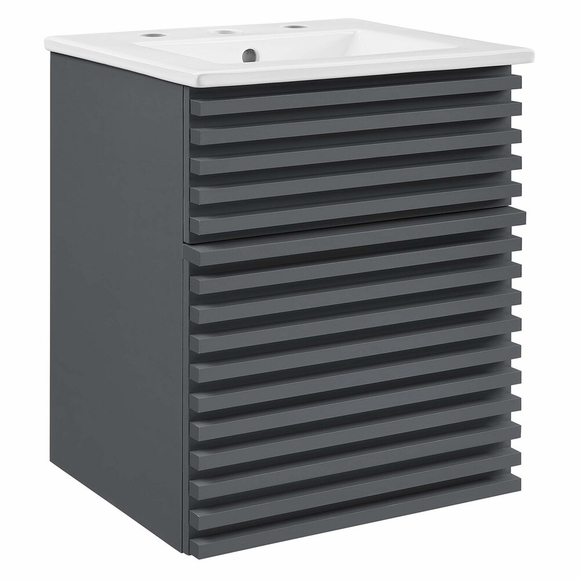 Tap into mid-century aesthetics with the Render Vanity. The Render 18" Bathroom Vanity features a durable MDF and particleboard frame with smooth walnut grain laminate, ample storage space in a full-extension drawer, and space-saving wall-mount design. Crafted with ceramic, a single sink with an integrated countertop, 8" centerset faucet holes, and rectangular sink basin continues the sleek look of this retro modern vanity. Clean lines and crisp design align for an edgy style designed to meet your needs. Boasting a mid-century modern style this vanity features a solid construction with a pleasing look and practical functionality. Assembly required and fixtures not included.