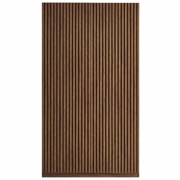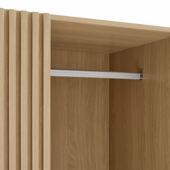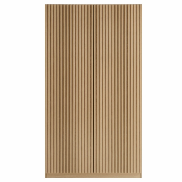 Tap into mid-century aesthetics with the Render Bedroom Wardrobe. This 2 door wardrobe with adjustable shelves features a durable particleboard frame with smooth wood grain laminate and vertical slatted detail all the way down the doors for a sleek, stunning look. The wardrobe armoire closet includes a spacious storage area behind soft-close doors, complete with two sturdy metal clothing bars and adjustable shelves for customizable storage space. This versatile 71 inch wardrobe cabinet with hanging rods provides ample room for organizing folded and hanging clothes, linens, and more. Perfect as a tall storage cabinet for bedroom or living room, this modern wardrobe with vertical slatted doors combines style and functionality. The Render Freestanding Closet boasts a solid construction, making it a practical addition to any room. Assembly required.