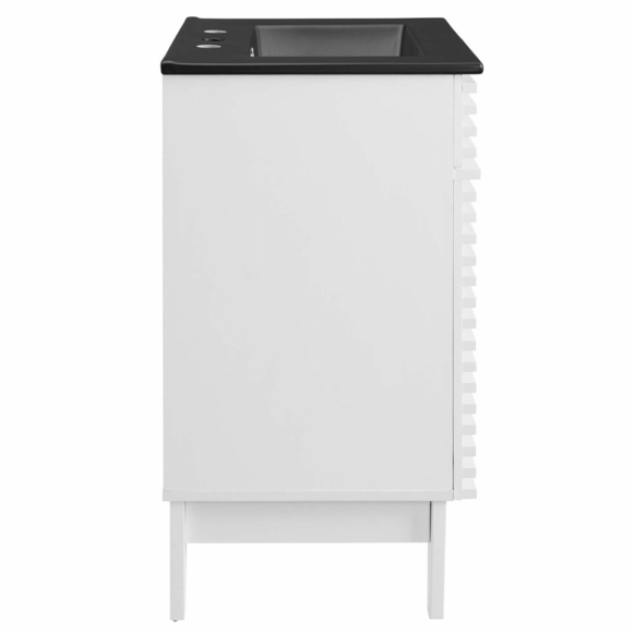 Tap into mid-century aesthetics with the Render Vanity. Render Bathroom Vanity features a durable particleboard frame with smooth laminate, four tapered wood legs, and adjustable storage shelf behind two soft-close hinged doors. A curved ceramic basin and integrated countertop with three faucet holes create sleek lines and crisp design for an edgy style designed to meet your needs. Boasting a mid-century modern style this vanity features a solid construction with a pleasing look and practical functionality. 8" centerset faucet holes. Assembly required and fixtures not included.