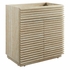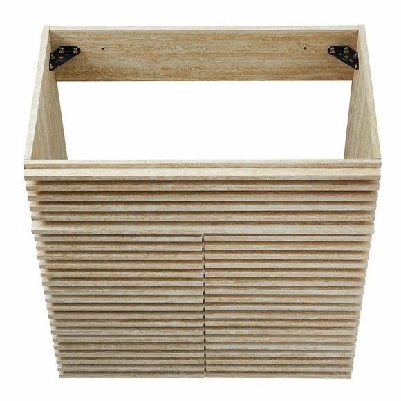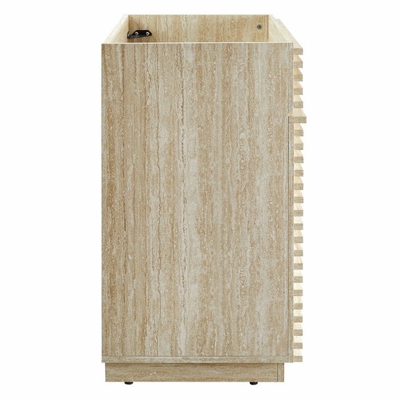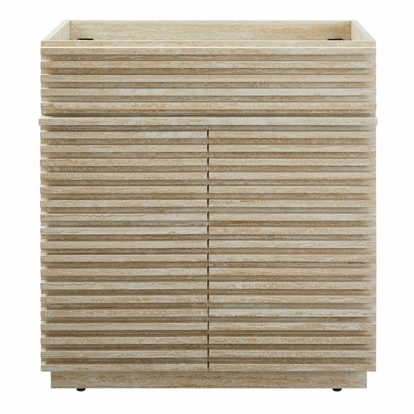 Tap into mid-century aesthetics with the Render 30 Inch Bathroom Vanity Cabinet. This slatted bathroom cabinet features a durable particleboard frame with faux travertine laminate and a sturdy plinth base. It includes an adjustable shelf behind two soft-close hinged doors, providing ample room for plumbing and storage. Designed to be paired with a sink basin and fixtures of your choice, this bathroom vanity with no sink is ready to complete your bathroom with your personal touch. Boasting a mid-century modern style, the Render bathroom vanity offers a solid construction with a pleasing look and practical functionality. Assembly required. Vanity bathroom sink and fixtures are not included.