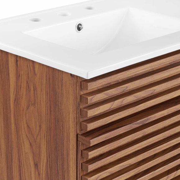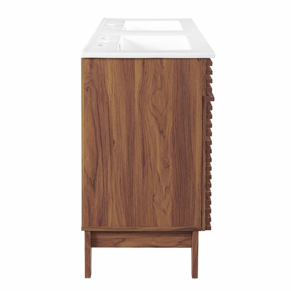 Tap into mid-century aesthetics with the Render Vanity. The Render 48" Bathroom Vanity features a durable MDF and particleboard frame with smooth walnut grain laminate, four tapered wood legs, and ample under sink storage space in full-extension drawers and behind soft-close hinged doors. Crafted with ceramic, a double sink with an integrated countertop, 8" centerset, and rectangular sink basins continue the sleek look of this retro modern vanity. Clean lines and crisp design align for an edgy style designed to meet your needs. Boasting a mid-century modern style this vanity features a solid construction with a pleasing look and practical functionality. This double sink has 8" between basins and 24" between basin sink holes. Assembly required and fixtures not included.
