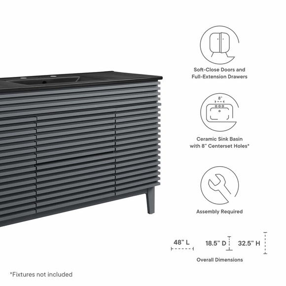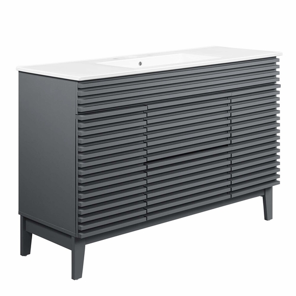 Tap into mid-century aesthetics with the Render Vanity. The Render 48" Bathroom Vanity features a durable MDF and particleboard frame with smooth walnut grain laminate, four tapered wood legs, and ample under sink storage space in full-extension drawers and behind soft-close hinged doors. Crafted with ceramic, a single sink with an integrated countertop, 8" centerset faucet holes, and rectangular sink basin continues the sleek look of this retro modern vanity. Clean lines and crisp design align for an edgy style designed to meet your needs. Boasting a mid-century modern style this vanity features a solid construction with a pleasing look and practical functionality. Assembly required and fixtures not included.