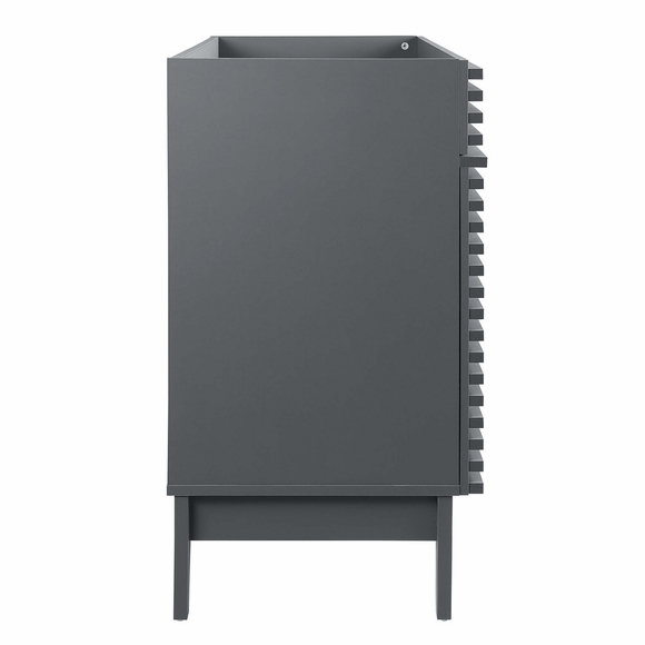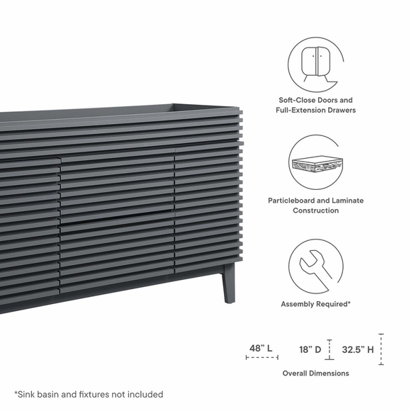 Tap into mid-century aesthetics with the Render Vanity. The Render 48" Bathroom Vanity features a durable MDF and particleboard frame with a smooth laminate, four tapered wood legs, and ample under sink storage space in full-extension drawers and behind soft-close hinged doors. Sleek lines and crisp design align for an edgy style designed to meet your needs. Boasting a mid-century modern style this vanity features a solid construction with a pleasing look and practical functionality. Assembly required. Sink basin and fixtures not included.