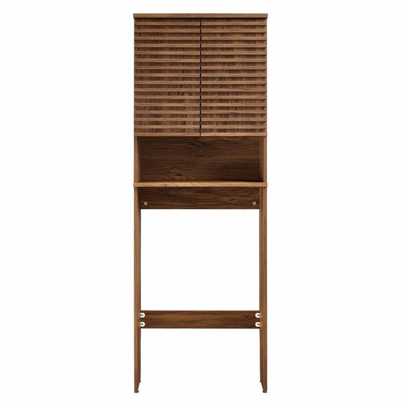 Tap into mid-century aesthetics with the Render Over the Toilet Storage Cabinet. This bathroom organizer over the toilet boasts one open shelf and a concealed storage area behind 2 soft-close hinged doors. Each door displays beautifully designed slatted details, creating sleek lines and a crisp look designed to bring modernity to your bathroom space. These doors open to reveal adjustable shelves within, offering a tailored storage solution. Matching the doors' modern aesthetic, the rest of this over the toilet organizer with cabinet is just as thoughtfully designed, featuring a durable particleboard frame with smooth wood grain laminate. Abounding in mid-century modern style, this above toilet storage cabinet offers a solid construction with a pleasing look and practical functionality perfect for storing towels, linens, toilet paper, makeup, and other bathroom essentials. This toilet cabinet includes non-marking floor glides to protect flooring. Assembly required.