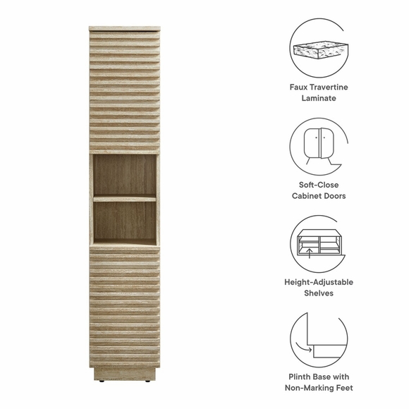 Tap into mid-century aesthetics with the Render Bathroom Storage Cabinet. This 63-inch tall storage cabinet boasts two open shelves and two concealed storage areas behind soft-close hinged doors. Each door on the bathroom tower displays beautifully designed slatted details, creating sleek lines and a crisp look designed to bring modernity to any room in your home, from the powder room to the living room to your kitchen or dining space. These doors open to reveal adjustable shelves within, offering a tailored storage solution. Matching the doors' modern aesthetic, the rest of the tall narrow cabinet is just as thoughtfully designed, featuring a durable particleboard frame with faux travertine laminate. Abounding in mid-century modern style, this tall bathroom storage cabinet with 2 doors offers a solid construction with a pleasing look and practical functionality perfect for storing towels, bathroom essentials, books, home decor, dinnerware, and more. This versatile linen cabinet includes non-marking glides to protect flooring. Assembly required.