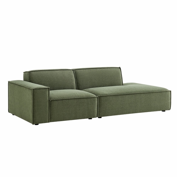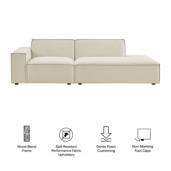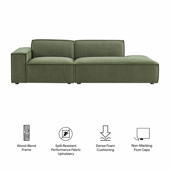 Create your custom living room and lounge area with the Restore Upholstered Fabric Modular Loveseat. The Restore Sectional Couch brings minimalist appeal with a crisp silhouette, broad lines, and French piping details wrapped in soft fabric upholstery. Featuring a high-performance upholstery fabric designed to repel water-based spills and stains-most messes blot away easily with a clean cloth. For stubborn residue, spray with a diluted dish soap solution and blot clean. Dense foam padding and a pocket coil spring system in each seat offer a comfortable, supportive feel for everyday lounging. Designed as a compact loveseat setup, this 2-piece set includes one left-facing armchair and one right-facing armless chaise, creating a relaxed layout that works well in smaller living spaces. Built-in connectors keep the pieces aligned and make it easy to expand over time with other Restore pieces. Built on a sturdy wood-blend frame with non-marking foot caps to help protect floors.