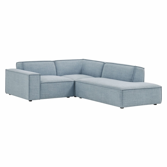 Create your custom living room and lounge area with the Restore Upholstered Fabric Modular Sectional Sofa. The Restore Sectional Couch brings minimalist appeal with a crisp silhouette, broad lines, and French piping details wrapped in soft fabric upholstery. Featuring a high-performance upholstery fabric designed to repel water-based spills and stains-most messes blot away easily with a clean cloth. For stubborn residue, spray with a diluted dish soap solution and blot clean. Dense foam padding and a pocket coil spring system in each seat offer a comfortable, supportive feel for everyday lounging. Designed as a compact L-shaped sectional, this 3-piece set includes one left-facing arm chair, one corner chair, and one right-facing chaise chair, creating a comfortable layout that works well in smaller living spaces. Built-in connectors keep the pieces aligned and make it easy to expand over time with other Restore pieces. Built on a sturdy wood-blend frame with non-marking foot caps to help protect floors.