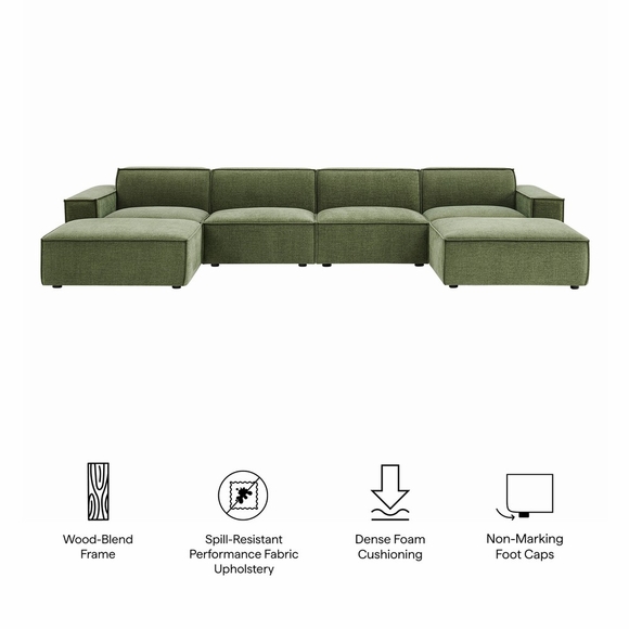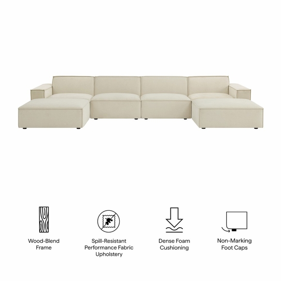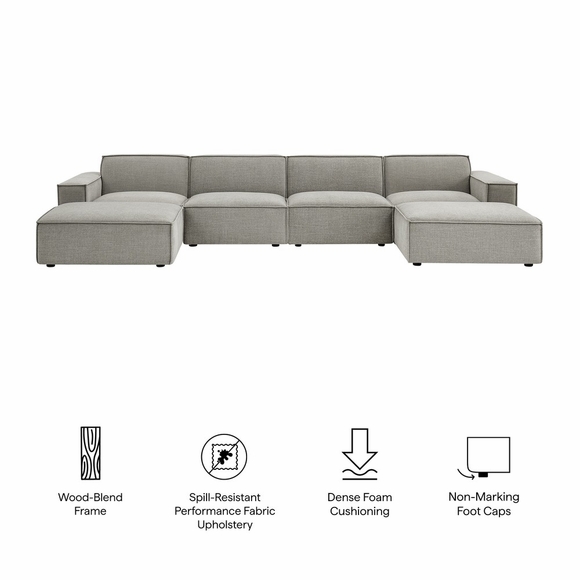 Create your custom living room and lounge area with the Restore Upholstered Fabric Modular Sectional Sofa. The Restore Sectional Couch brings minimalist appeal with a crisp silhouette, broad lines, and French piping details wrapped in soft fabric upholstery. Featuring a high-performance upholstery fabric designed to repel water-based spills and stains-most messes blot away easily with a clean cloth. For stubborn residue, spray with a diluted dish soap solution and blot clean. Dense foam padding and a pocket coil spring system in each seat offer a comfortable, supportive feel for everyday lounging. Designed as a versatile modular setup, this 6-piece set includes one left-facing arm piece, one right-facing arm piece, two armless chairs, and two matching ottomans. Built-in connectors keep the pieces aligned and allow you to reconfigure or expand the layout over time with other Restore pieces. Built on a sturdy wood-blend frame with non-marking foot caps to help protect floors.