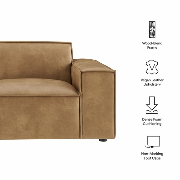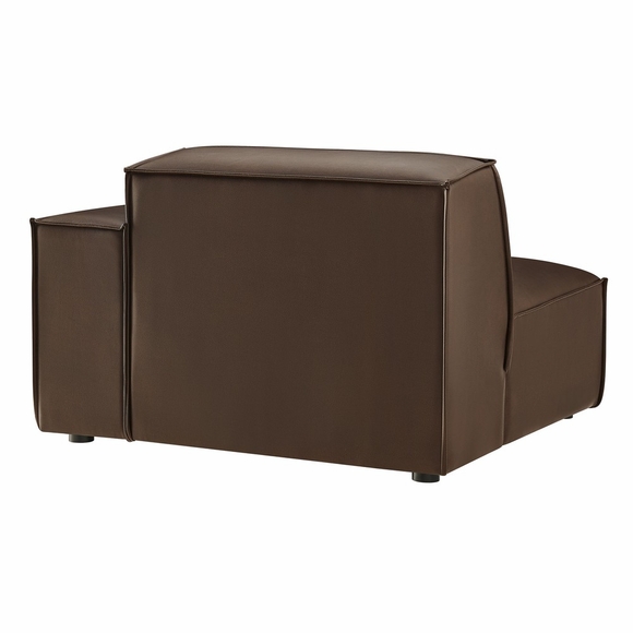 Create your custom living room or lounge with the Restore Right-facing Modular Armchair. Featuring a low, clean silhouette with broad lines and French piping details, this sofa chair is wrapped in soft vegan leather upholstery. Inside, dense foam padding and a pocket coil spring system give the seat a comfortable, supportive feel perfect for everyday use. Built on a sturdy wood-blend frame with non-marking foot caps to help protect floors, this faux leather chair can stand on its own or connect easily to other Restore pieces using the built-in connectors. Chair weight capacity: 440 lbs.