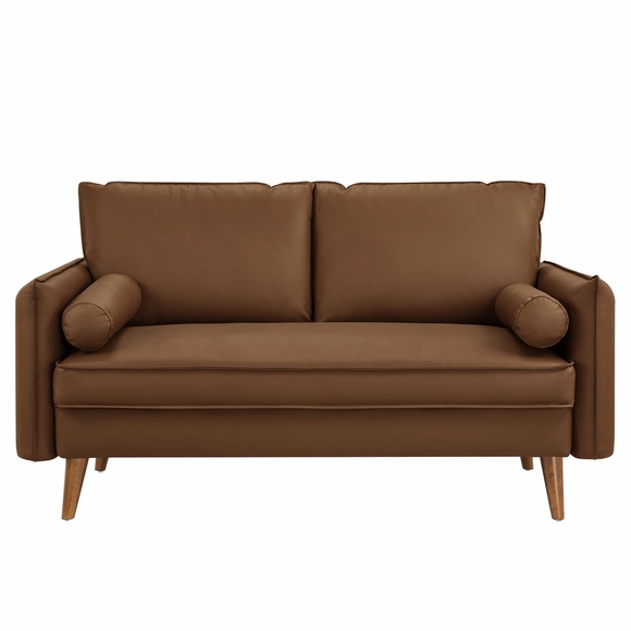Give new vitality to your home or apartment with the Revive Faux Leather Loveseat. With its sleek, tailored profile and two plush bolster pillows, this modern love seat invites guests to settle in and stay awhile. Upholstered in rich vegan leather, this loveseat sofa exudes an approachable elegance, perfectly complemented by its clean lines and splayed wood legs. Whether placed in a cozy corner or serving as a stylish centerpiece in your living space, the Revive small sofa brings a touch of mid-century modern flair to any setting, creating a welcoming spot for relaxation and conversation. With its perfect blend of contemporary design and classic comfort, the Revive 2-seater sofa effortlessly enhances the ambiance of any space. Weight Capacity: 661 lbs.