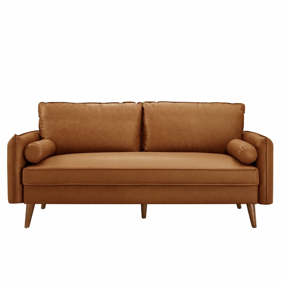 Give new vitality to your home or apartment with the Revive Faux Leather Sofa. With its sleek, tailored profile and two plush bolster pillows, this mid-century modern couch invites guests to settle in and stay awhile. Upholstered in rich vegan leather, this faux leather couch exudes an approachable elegance, perfectly complemented by its clean lines and splayed wood legs. Designed for both comfort and style, the durable faux leather upholstery allows this vintage sofa to maintain its charm through everyday use. Whether positioned in a living room, office, or entertainment area, the Revive 72" sofa offers a welcoming spot for relaxation and conversation. With its perfect blend of contemporary design and classic comfort, the Revive Mid-Century Sofa effortlessly enhances the ambiance of any space. Weight Capacity: 600 lbs.