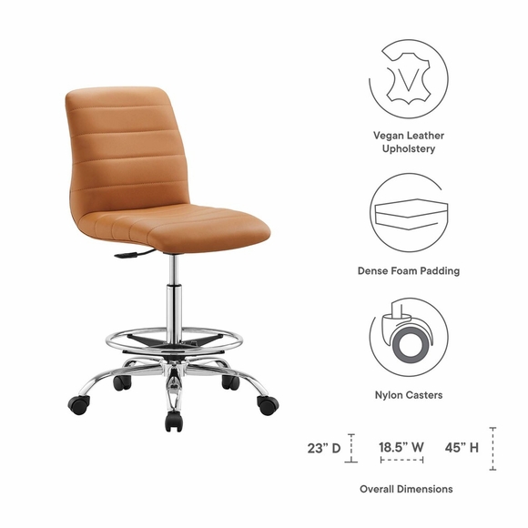Focus on the task at hand while bringing modern style to your workspace with the Ripple Armless Drafting Chair. Outfitted with a chrome metal frame and five dual-wheel casters for easy mobility over hardwood or carpeted surfaces, this padded drafting stool is upholstered in durable vegan leather and covered in dense foam for added comfort. An ergonomic choice for workstations, this vegan leather drafting-height office chair features a mid-back design, channel tufting, and fine stitching throughout. This drafting chair is fully height adjustable with a 360-degree swivel and its drafting-height makes it suitable for standing desks, drafting tables, reception desks, and more. Assembly required. Weight Capacity: 287 lbs.