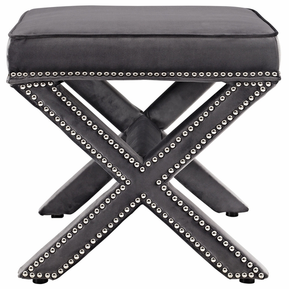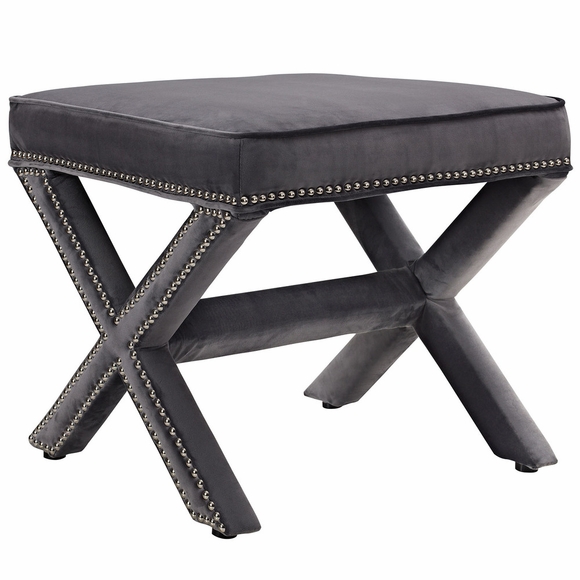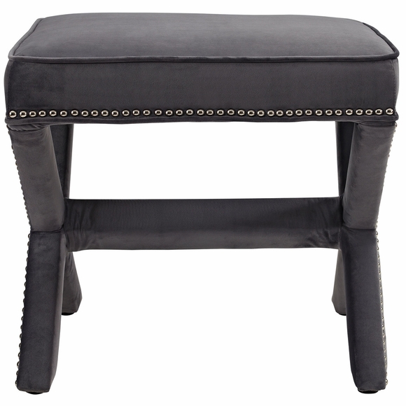Add charm to your home or apartment decor with the Rivet Ottoman. Featuring timeless nailhead trim, an elegant X-base frame, and surrounded by stain-resistant velvet fabric with dense foam padding, Rivet is a perfectly soft and cozy ottoman for the chic modern lifestyle. Rivet is available in a variety of engaging colors and is the perfect addition to bed, living, and lounge rooms. Ottoman Weight Capacity: 331 lbs.