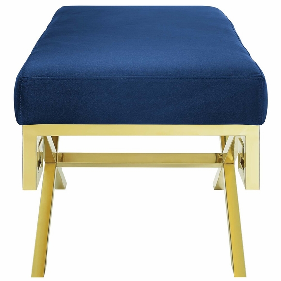 Embrace modern whimsy with Rove Performace Velvet Accent Bench. Brimming with energy and a sleek modern look, Rove features a polished gold stainless steel base with a Greek Key design, dense foam padding, and a soft stain-resistant performance velvet polyester upholstered top. A striking statement piece in the living room, bedroom or lounge area, Rove can support up to 331 pounds and comes with foot pads to help protect your flooring.