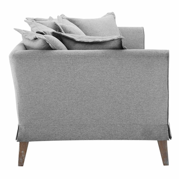 Inspire calming comfort and relaxed style in your living space with the Rowan Fabric Sofa. Inviting guests to sit and stay for a while, this living room sofa features a casual yet tailored design brimming with modern farmhouse charm. Resting atop a sturdy wood frame with rustic distressing, this sofa grants a premium seating experience thanks to its soft fabric upholstery, seven throw pillows, and dense foam padding. Shipping directly to your doorstep, this sofa modernizes the traditional furniture shopping experience. Sofa Weight Capacity: 1322 lbs.