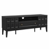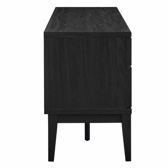 Harmonize retro style and modern functionality in your living space with the Samos 59" TV Stand. Durably crafted with a sleek laminate finish, this vintage-inspired entertainment center showcases a bold geometric raised panel design on its doors, adding depth and elegance. Built for TVs up to 65 inches, the low TV stand includes two spacious storage compartments concealed behind push-to-open doors with the distinctive geometric pattern, a full-glide center drawer for additional storage, and an open media shelf above with cable management, ideal for organizing media devices. Supported by sturdy legs with central leveling legs for enhanced stability, this low-profile media console offers practical storage while enriching your decor. Perfect for mid-century inspired living rooms, the Samos Modern Style TV Stand is designed to blend functionality with vintage charm in one versatile piece. Assembly required. Weight capacity: 198 lbs.