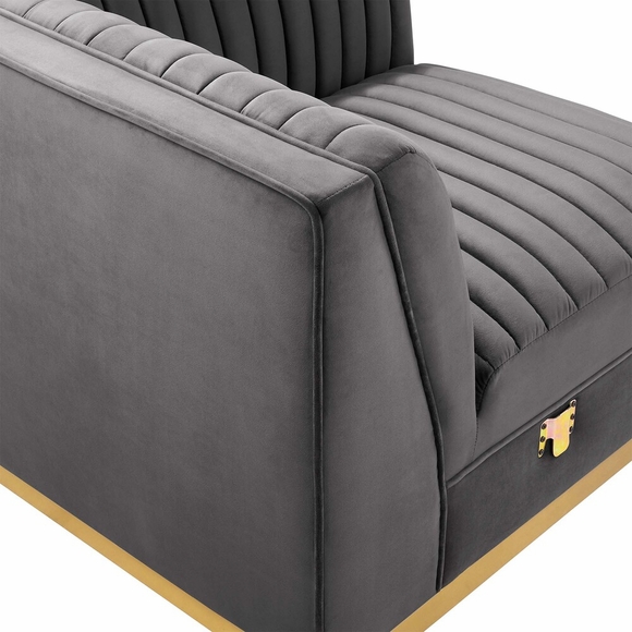 Glamour radiates from the organic linear design of the Sanguine Channel Tufted Performance Velvet Left-Facing Modular Sectional Sofa. Relax and follow the vertical channel tufting for a streamlined look that adds retro modern glamour to your living room, lounge, or home office. Soft, stain-resistant performance velvet upholstery creates a luxurious tactile experience while dense foam padding and an individually wrapped spring coil system provide ultimate comfort and support for this sectional sofa. Solidly constructed from eucalyptus wood and plywood, this sectional sofa is an eye-catching addition. Sanguine's palatial accents and premium comfort rest securely on a gold stainless steel base that complements any contemporary modern home or apartment. Includes non-marking foot pads to protect flooring and modular connectors. Each Seat Weight Capacity: 330 lbs.