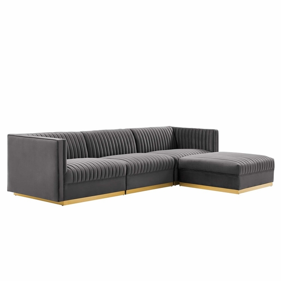 Glamour radiates from the organic linear design of the Sanguine Channel Tufted Performance Velvet Modular Sectional Sofa. Relax and follow the vertical channel tufting for a streamlined look that adds retro modern glamour to your living room, lounge, or home office. Soft, stain-resistant performance velvet upholstery creates a luxurious tactile experience while dense foam padding and an individually wrapped spring coil system provide ultimate comfort and support for this sectional sofa. Solidly constructed from eucalyptus wood and plywood, this sectional sofa is an eye-catching addition. Sanguine's palatial accents and premium comfort rest securely on a gold stainless steel base that complements any contemporary modern home or apartment. Includes non-marking foot pads to protect flooring and modular connectors. Each Seat Weight Capacity: 330 lbs.