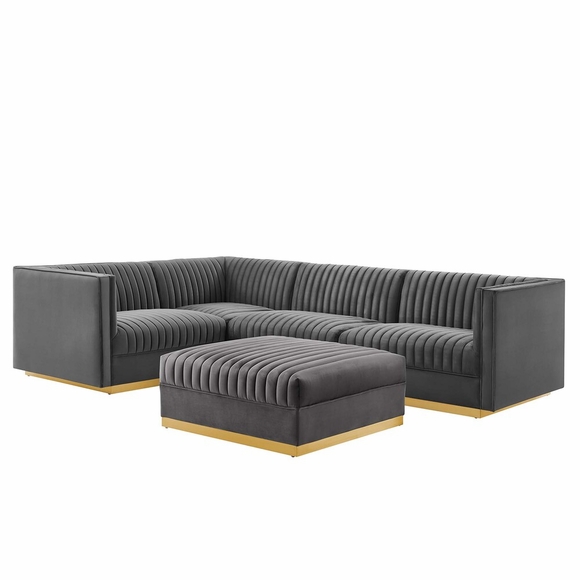 Glamour radiates from the organic linear design of the Sanguine Channel Tufted Performance Velvet Left-Facing Modular Sectional Sofa. Relax and follow the vertical channel tufting for a streamlined look that adds retro modern glamour to your living room, lounge, or home office. Soft, stain-resistant performance velvet upholstery creates a luxurious tactile experience while dense foam padding and an individually wrapped spring coil system provide ultimate comfort and support for this sectional sofa. Solidly constructed from eucalyptus wood and plywood, this sectional sofa is an eye-catching addition. Sanguine's palatial accents and premium comfort rest securely on a gold stainless steel base that complements any contemporary modern home or apartment. Includes non-marking foot pads to protect flooring and modular connectors. Each Seat Weight Capacity: 330 lbs.